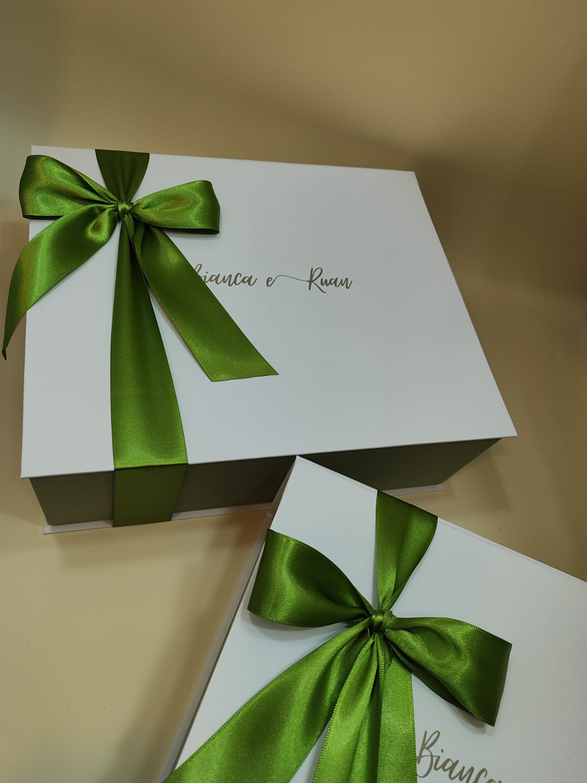 Os nomes são impressos com uma tipografia moderna e elegante, tornando-a uma opção ideal para casamentos, aniversários, ou como embalagem personalizada para produtos exclusivos. Sua estrutura sólida e a combinação de cores neutras com o laço vibrante tornam essa caixa perfeita para embalar presentes, produtos ou lembrancinhas com classe.